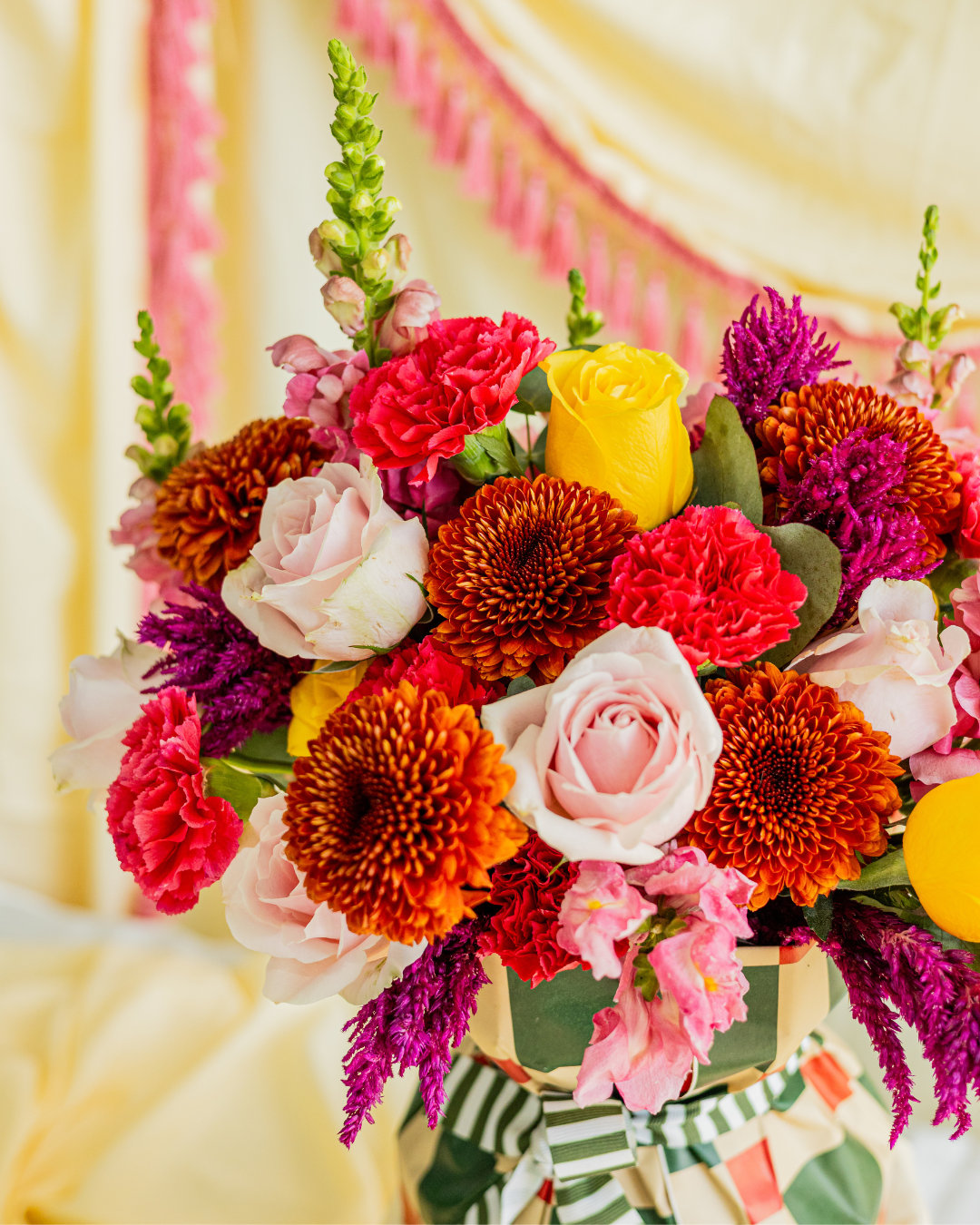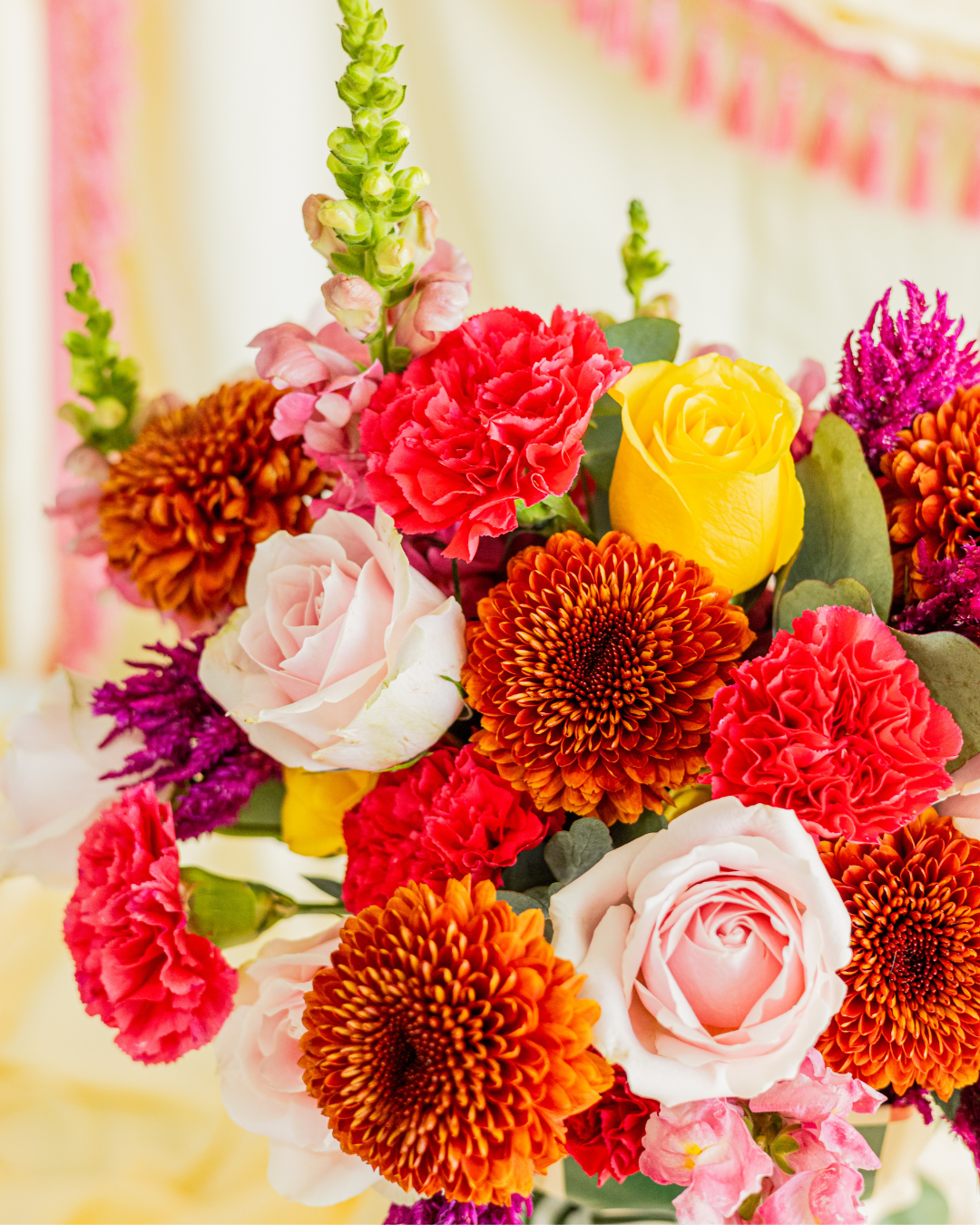 Light Pink & Yellow Rose, Dark Pink Carnation, Pink Snapdragon, Red Disbuds, Purple Rocket Celosia