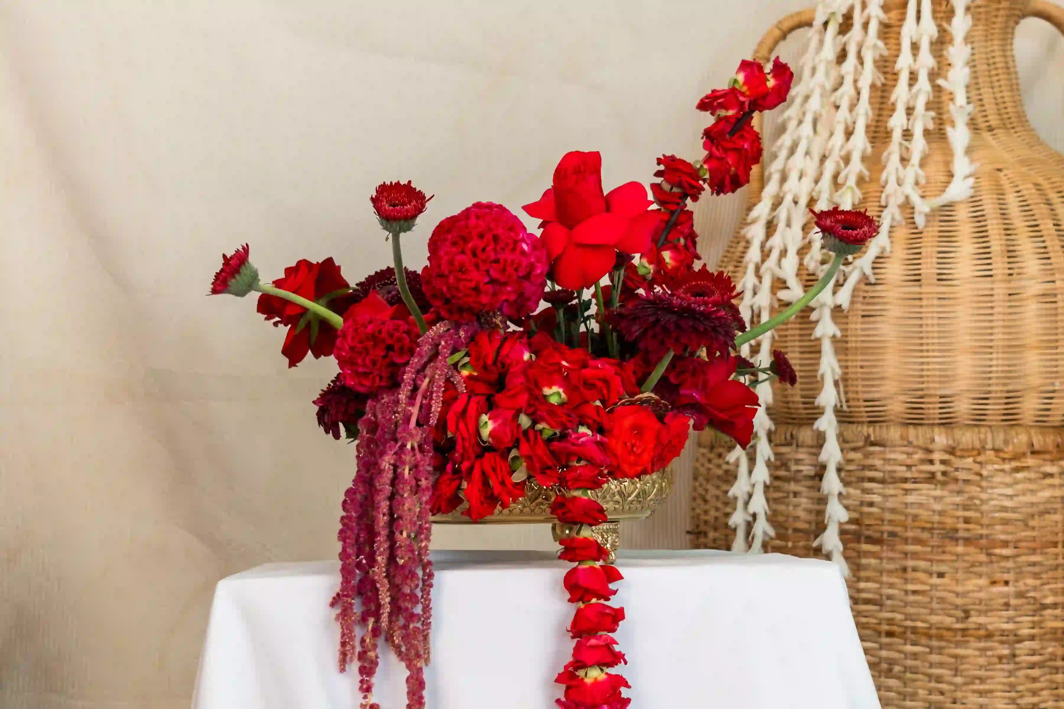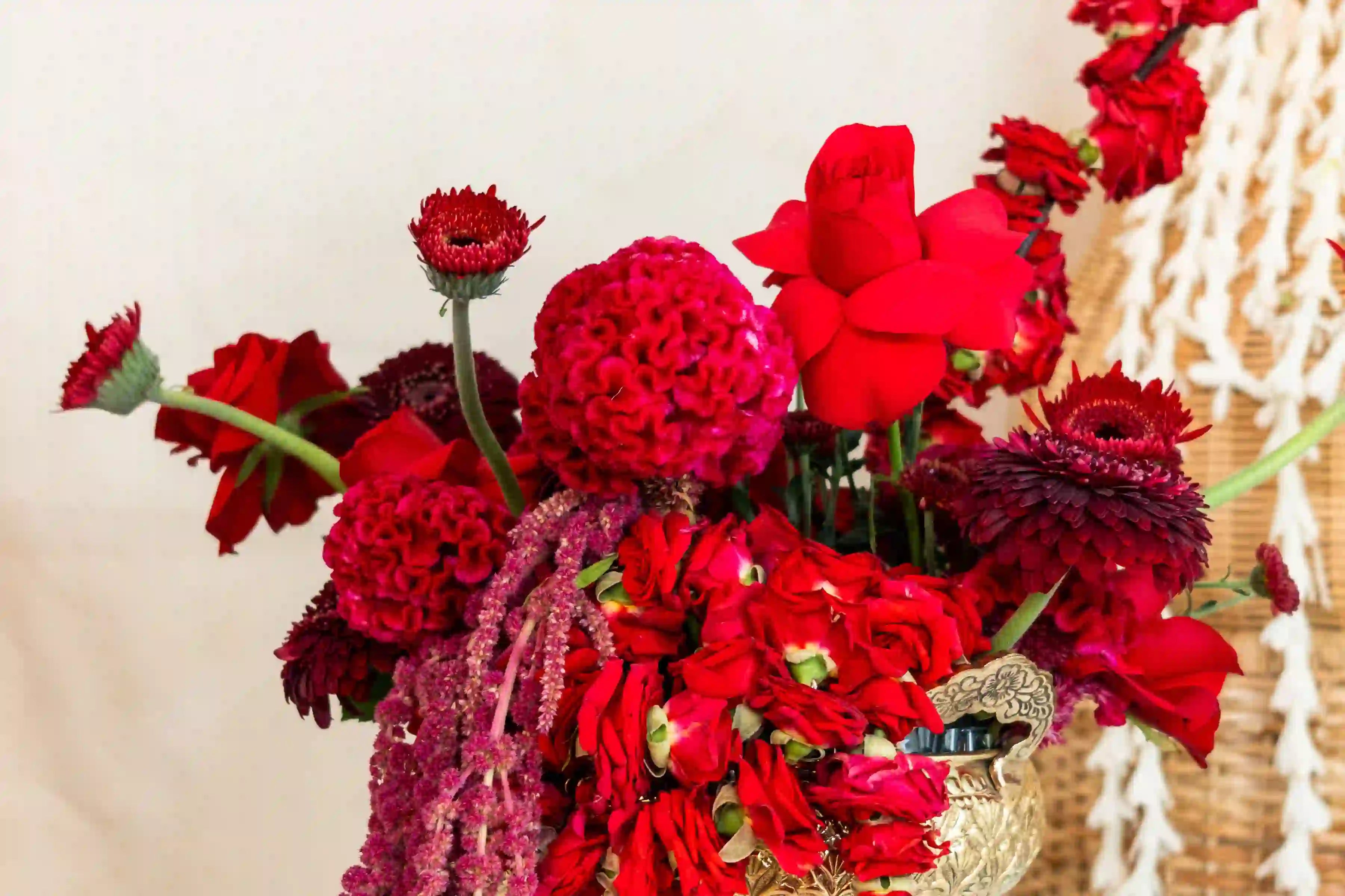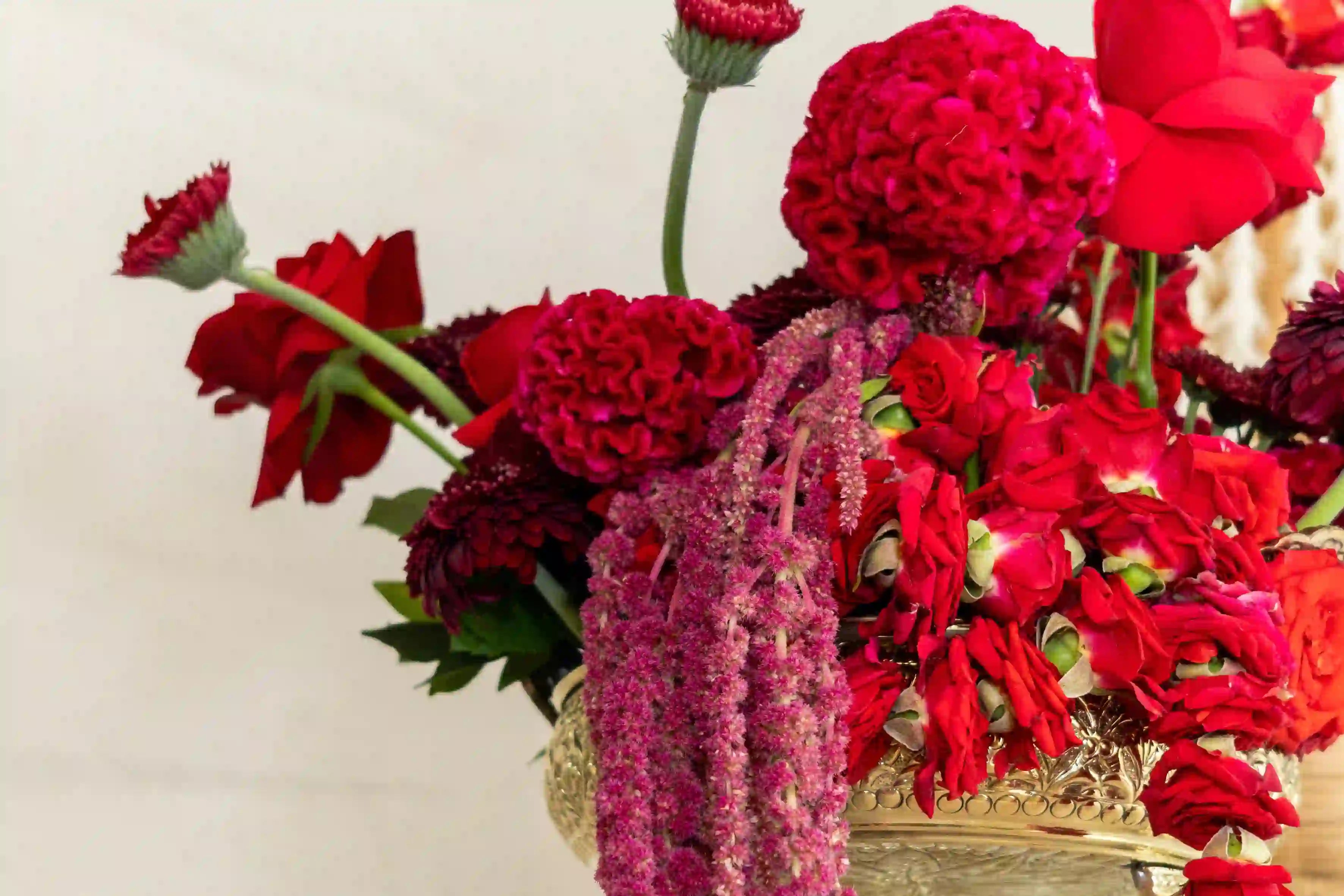 Incomparable by design. This striking all-red arrangement features deep scarlet roses, burgundy chrysanthemums, and cascading crimson amaranthus in an ornate gold vessel. Every bloom is a study in red—from scarlet to burgundy to wine—creating a monochromatic masterpiece with dramatic vertical presence. “Ananya” means unique in Sanskrit, and this arrangement lives up to its name.