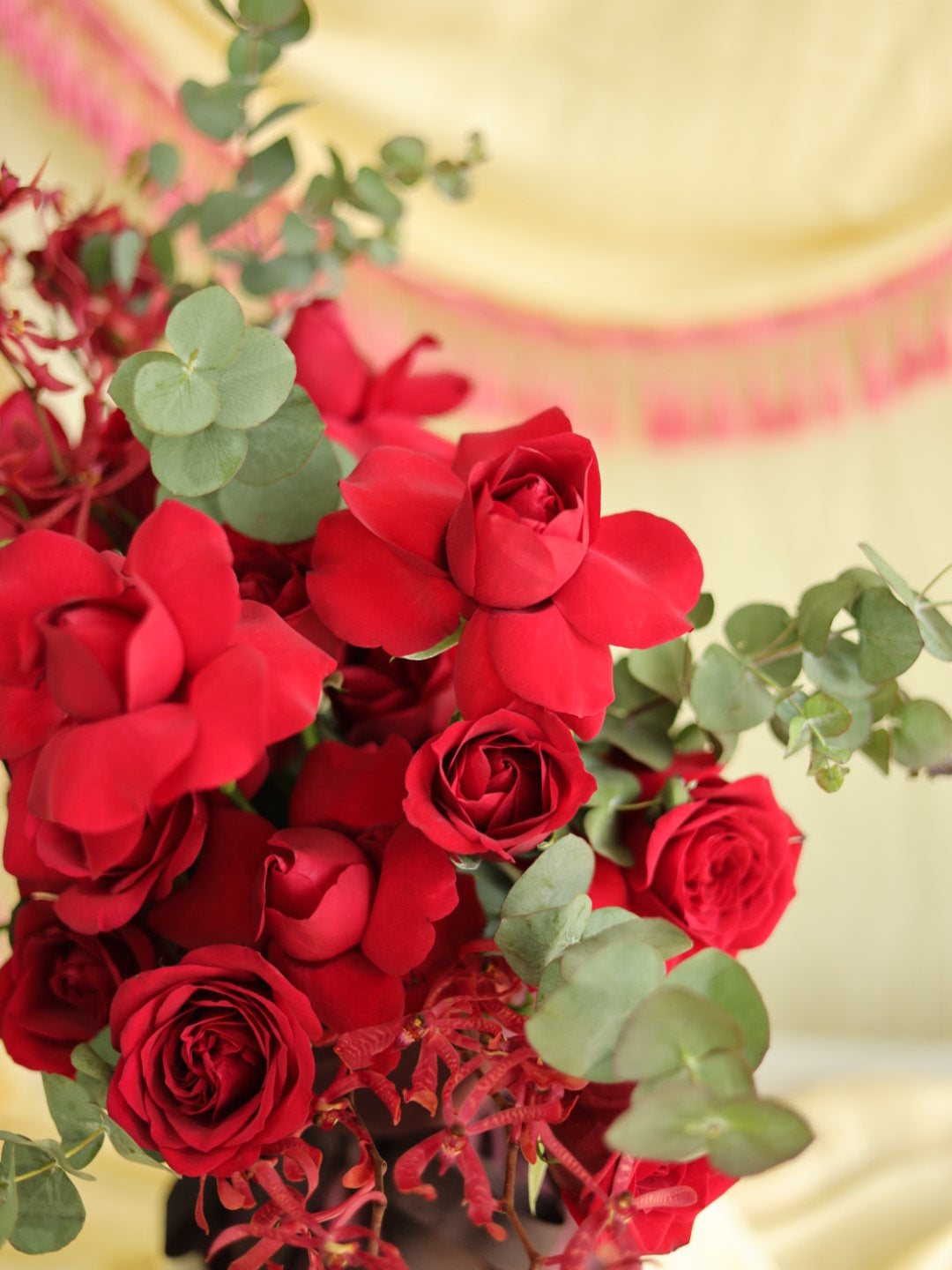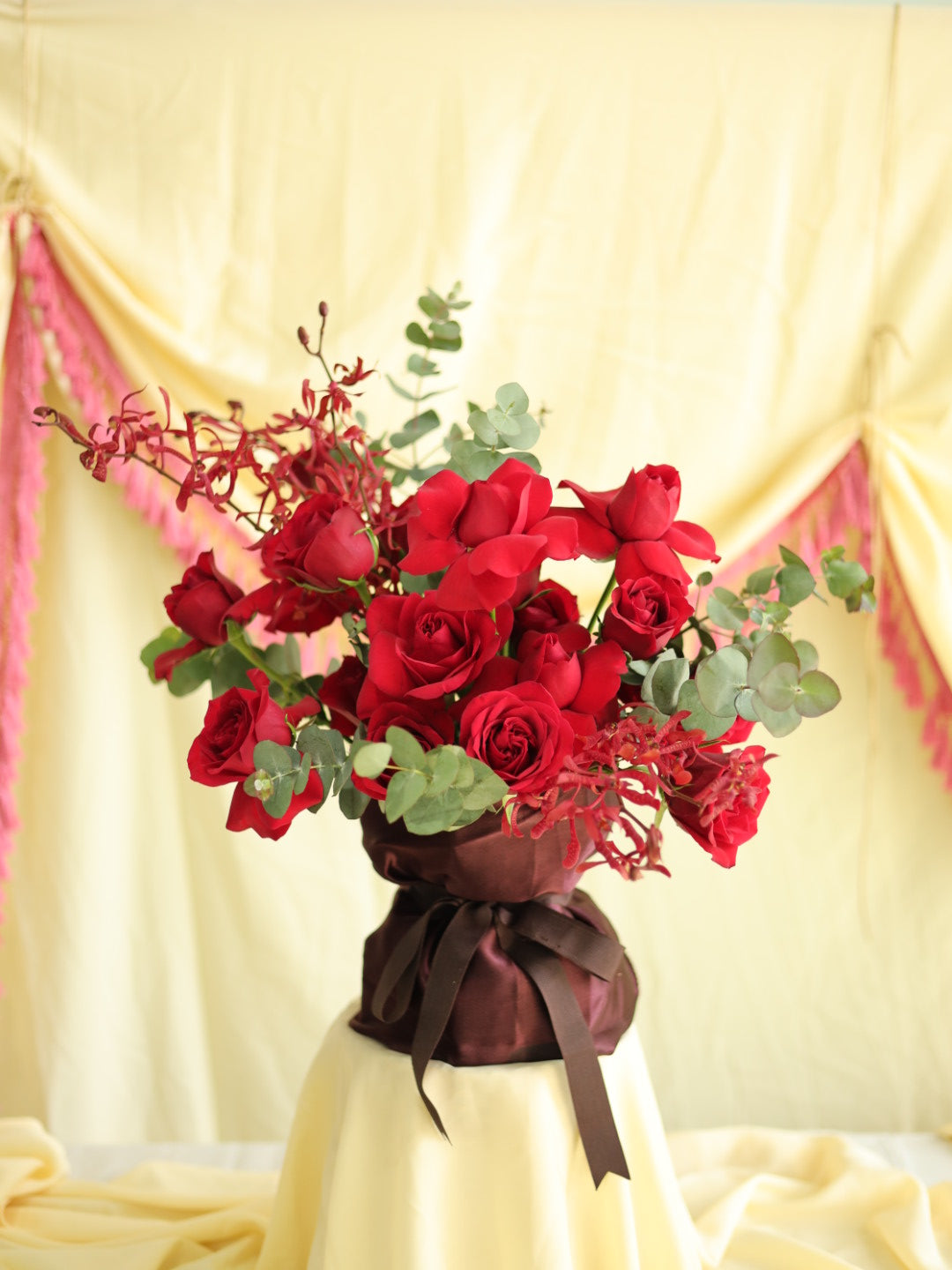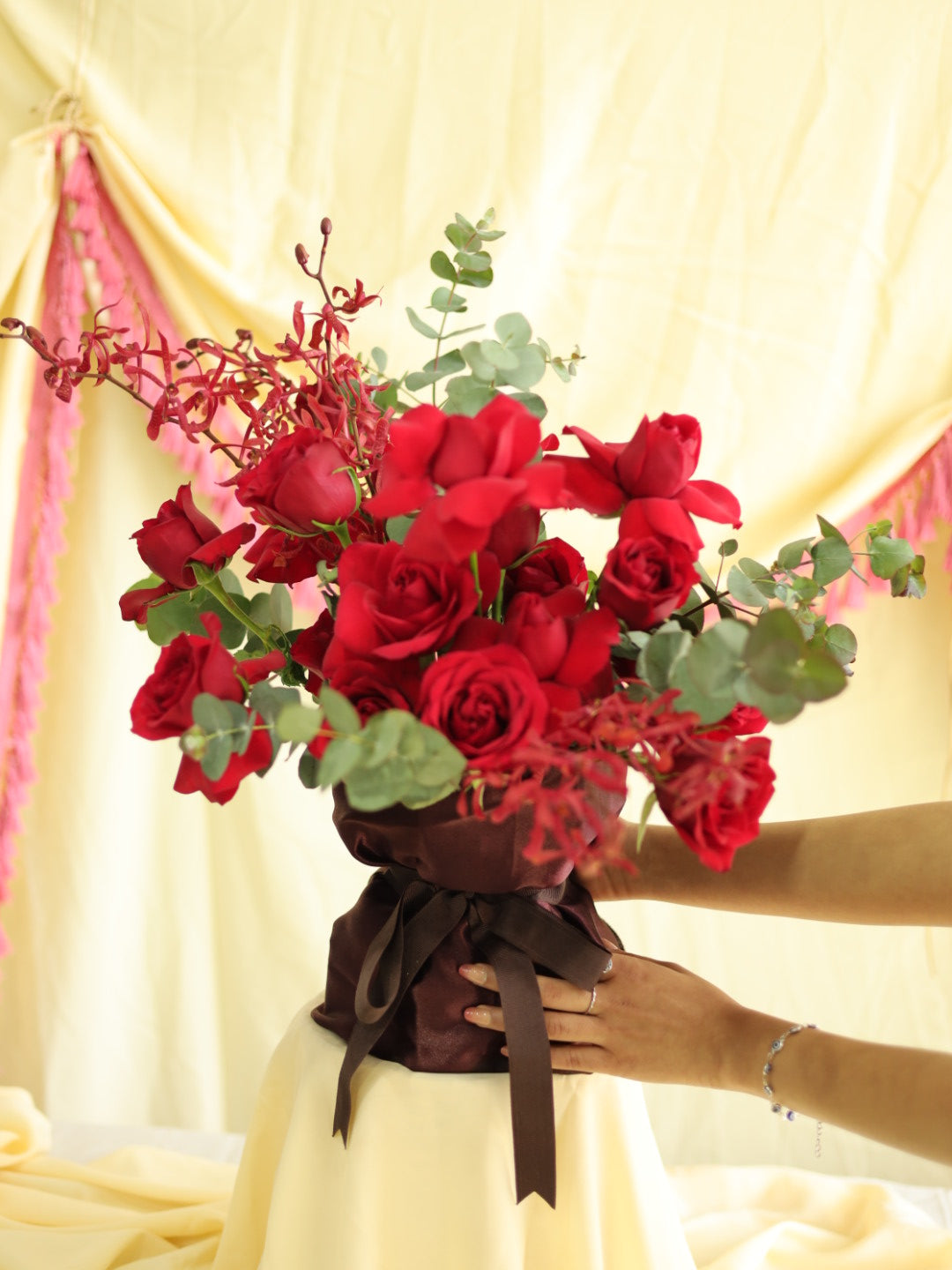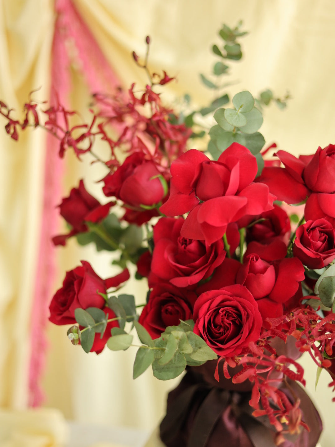 Red Rose, Red Anne Black Orchids, Green Eucalyptus