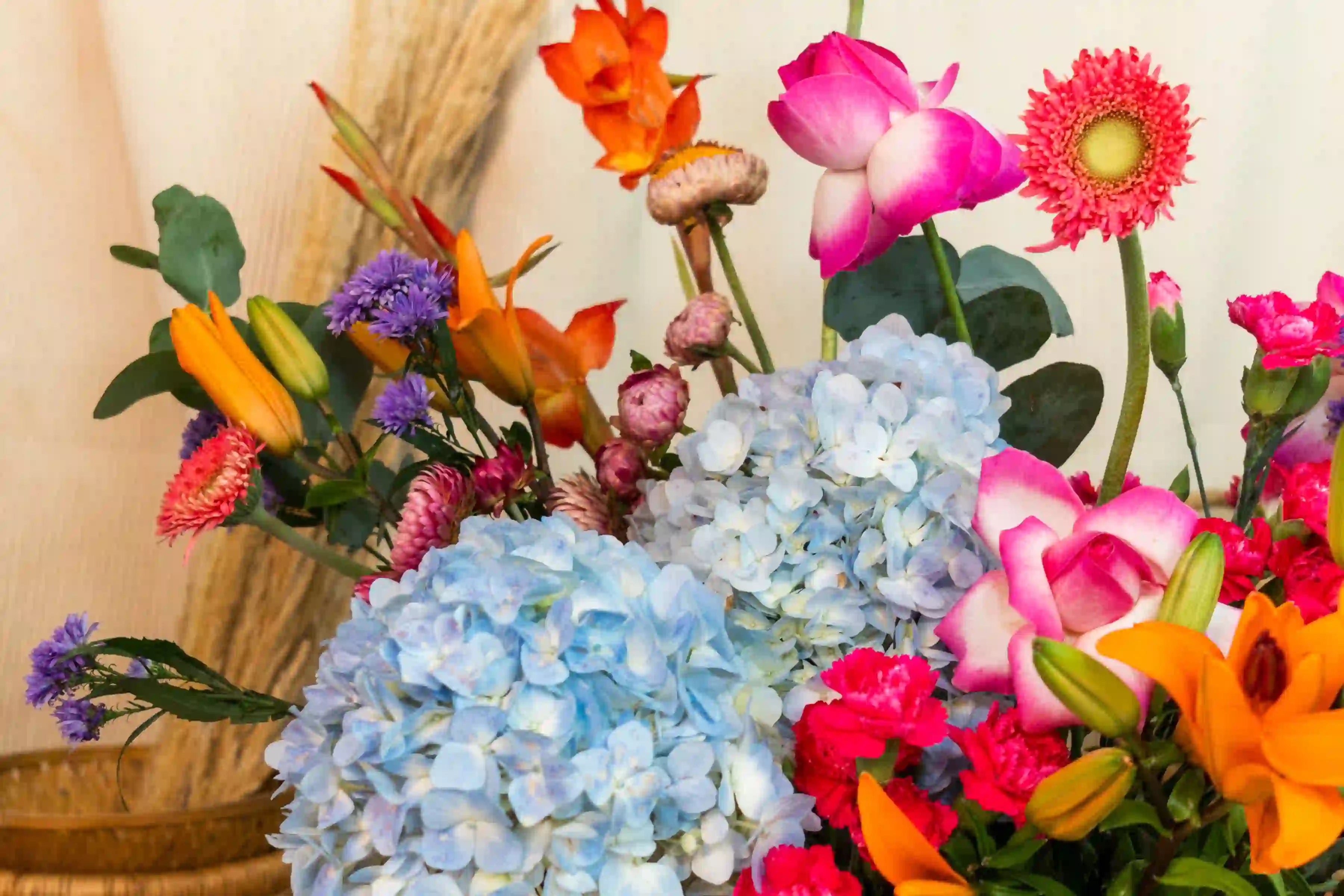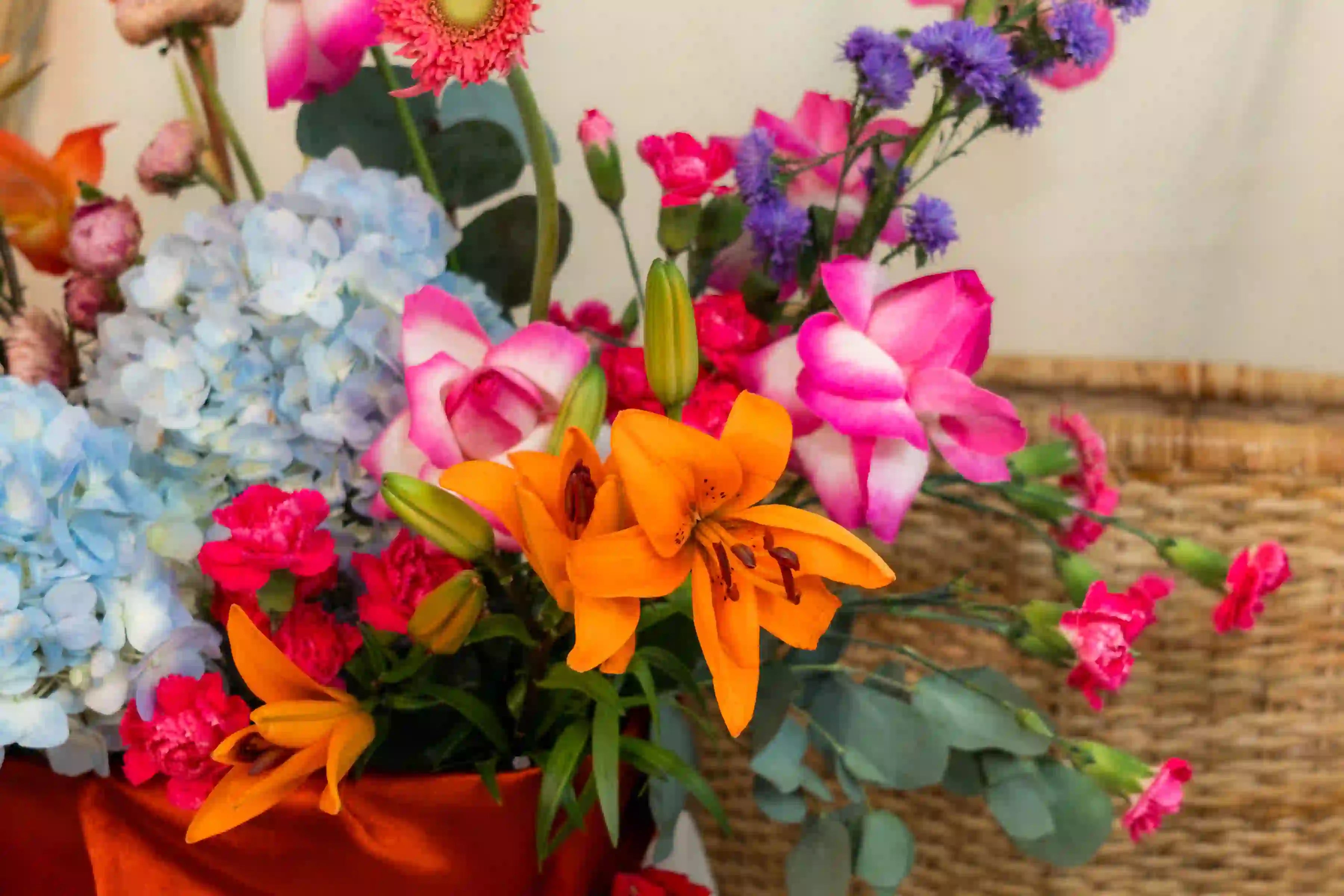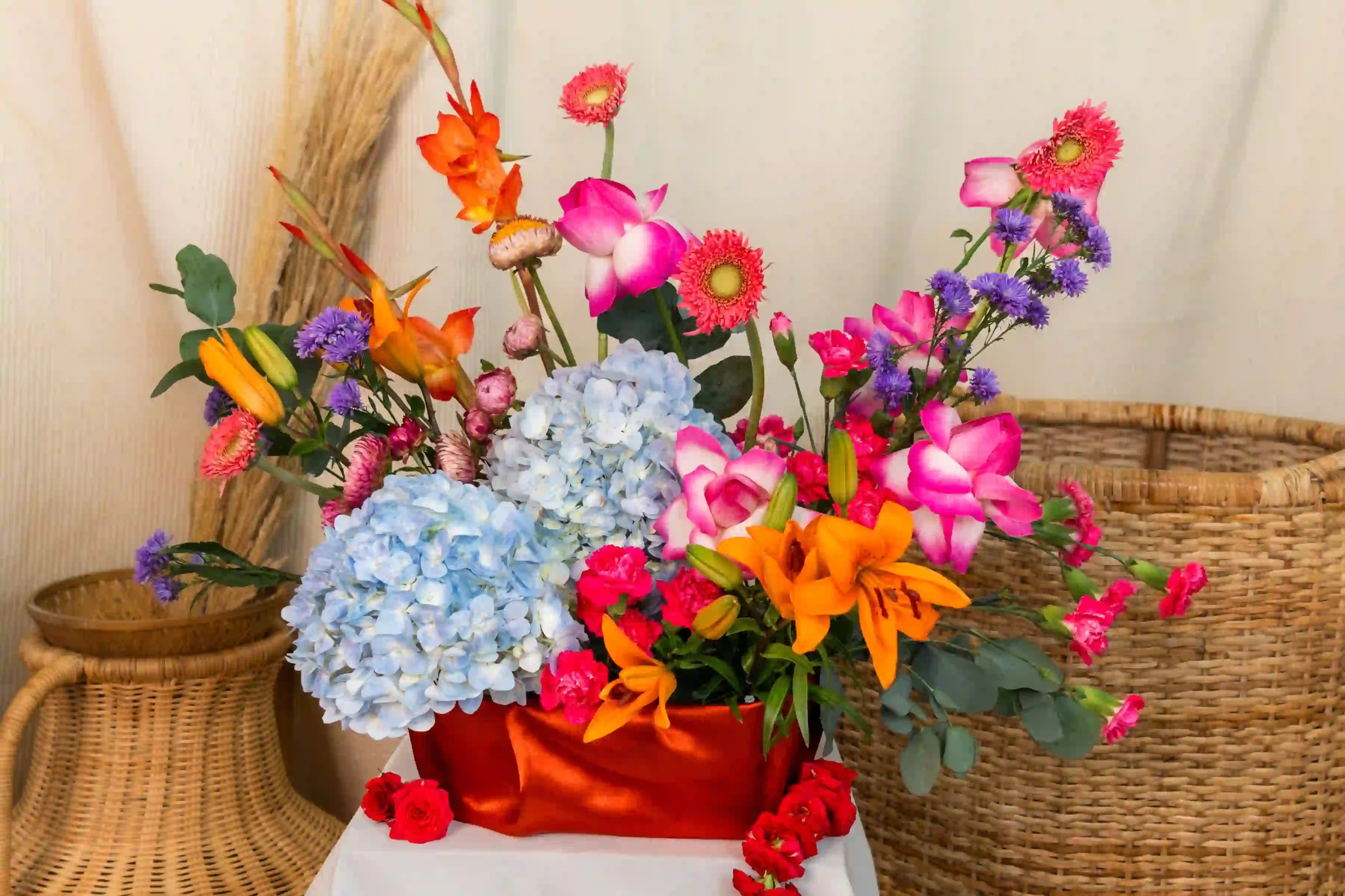 Maximum color, maximum celebration. This showstopping arrangement is a swirling kaleidoscope of hydrangeas, lilies, gerberas, roses, and exotic blooms in a luxe red silk container. Blue meets orange meets pink meets purple—it’s controlled chaos at its most beautiful. Perfect for Diwali celebrations that deserve center stage, Vortex doesn’t just fill a room, it commands it.